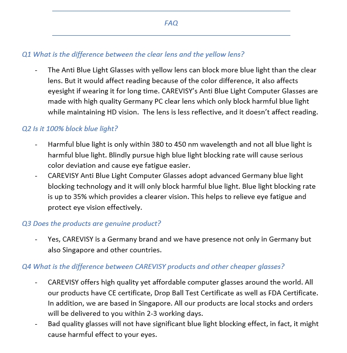 Welcome to CAREVISY, a professional Eyewear brand. We provide high quality Reading Glasses, Computer Glasses, Sunglasses and other Eyewear Accessories at affordable prices based in Singapore. Customer's satisfaction is our top priority. We valued customer's time and we will post out your order by next day. Afterwards, logistic team will pick up your parcel and delivery it to you, expected delivery time by logistic team is about 1-2 working days. Feel free to contact us if you have any queries. Care for your vision and enjoy your shopping now!
