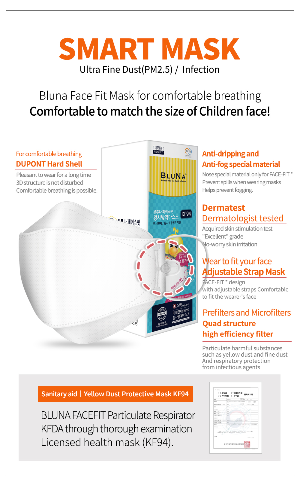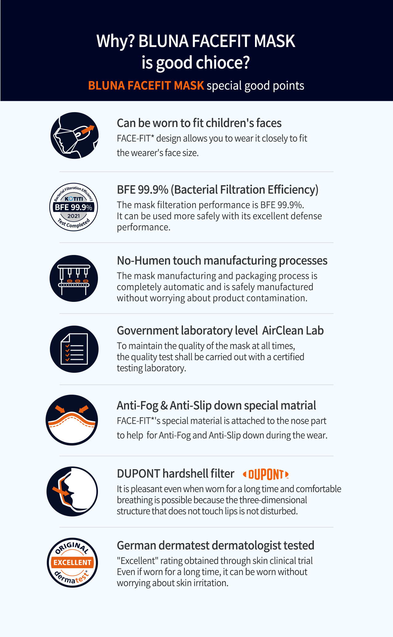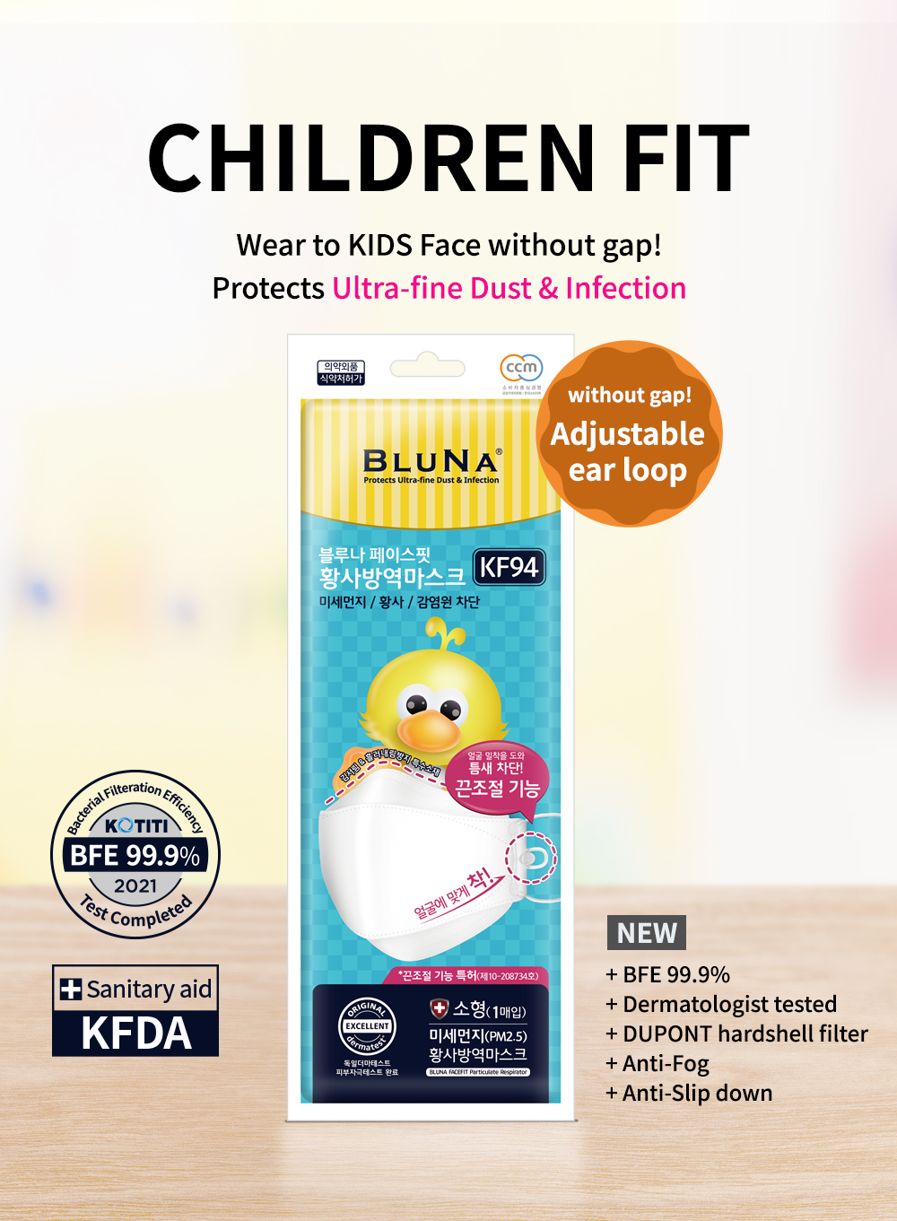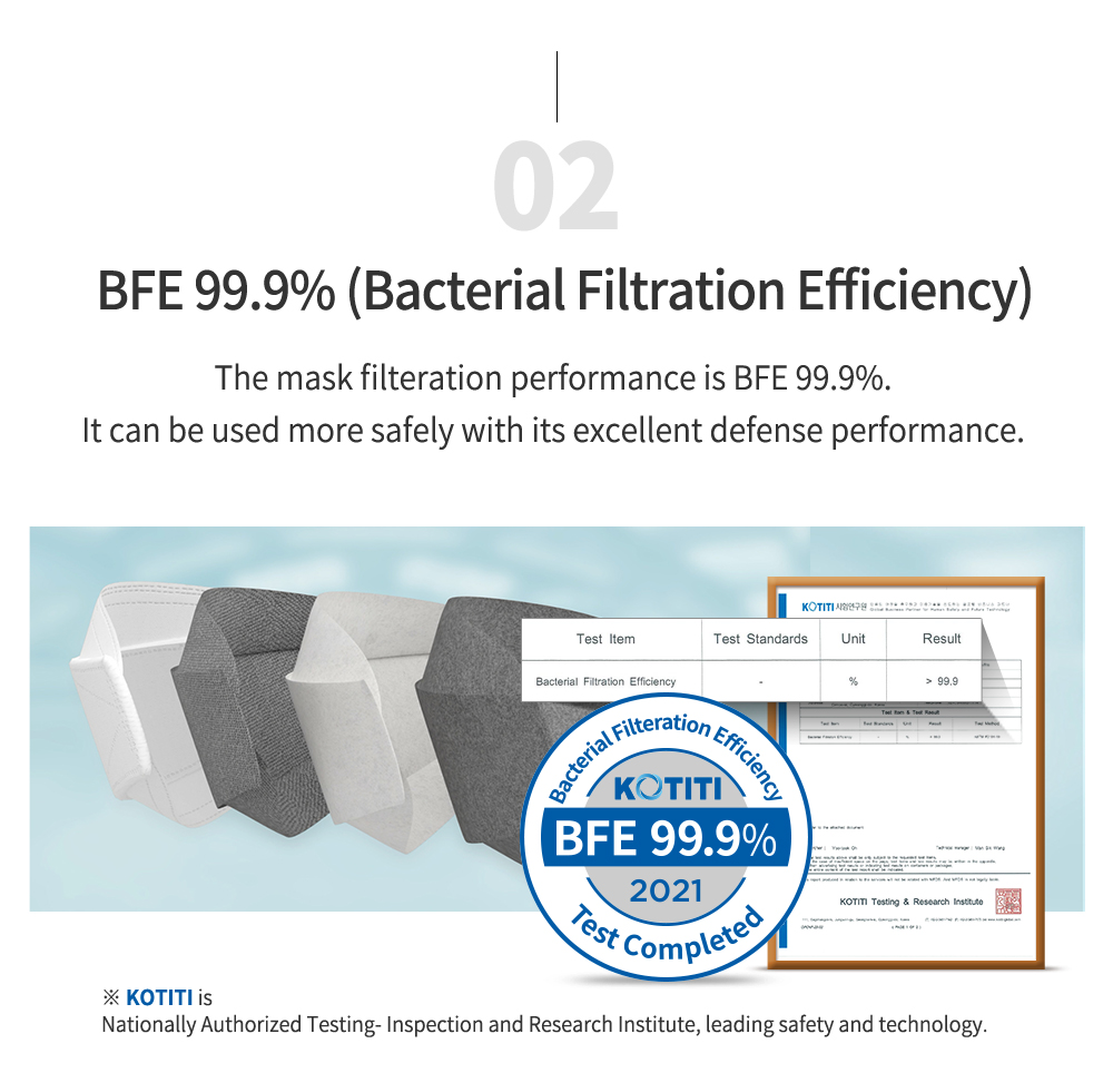 - BFE (Bacterial Filtration Efficiency)99.9% tested by KOTITI, Korea