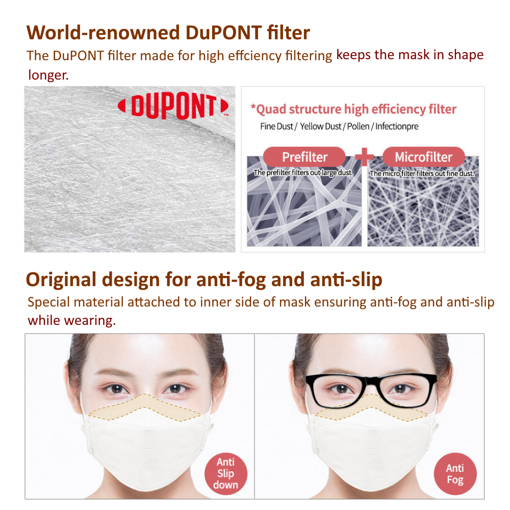 Renowned DuPont filter with three-dimensional structure which allows easy breathing and comfortable wearing. Mask does NOT touch wearer's lip.