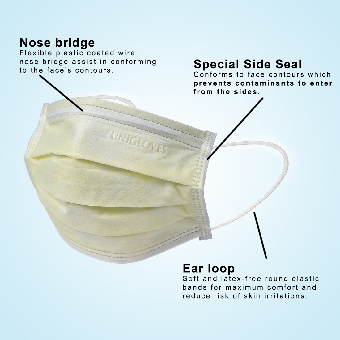 UNIGLOVES 3ply Surgical Face Mask, Earloop - Yellow [Premium Quality Medical Grade] 50pcs/box