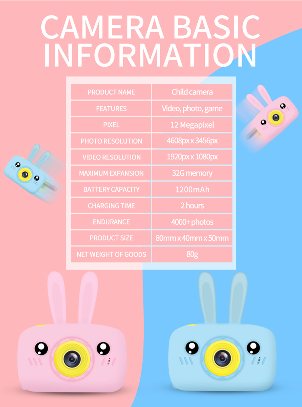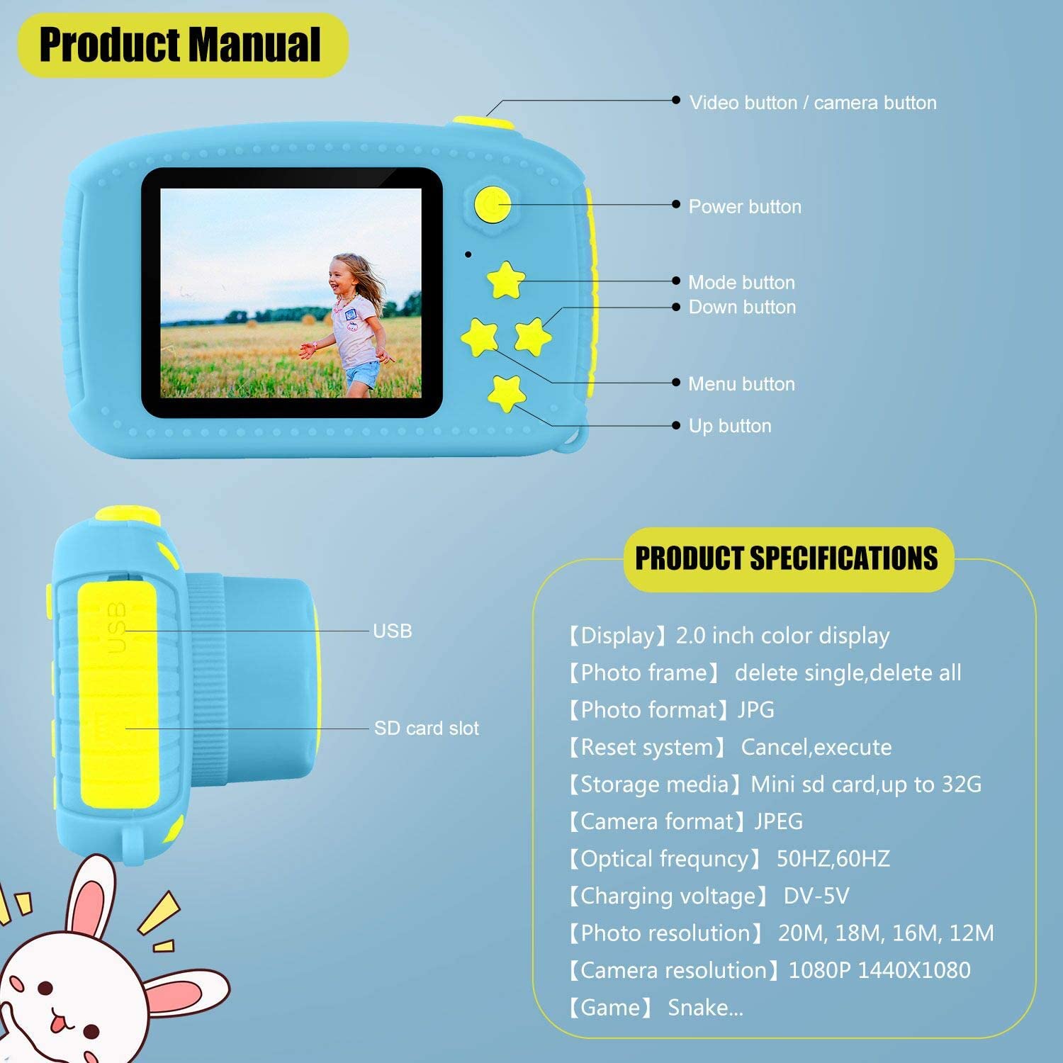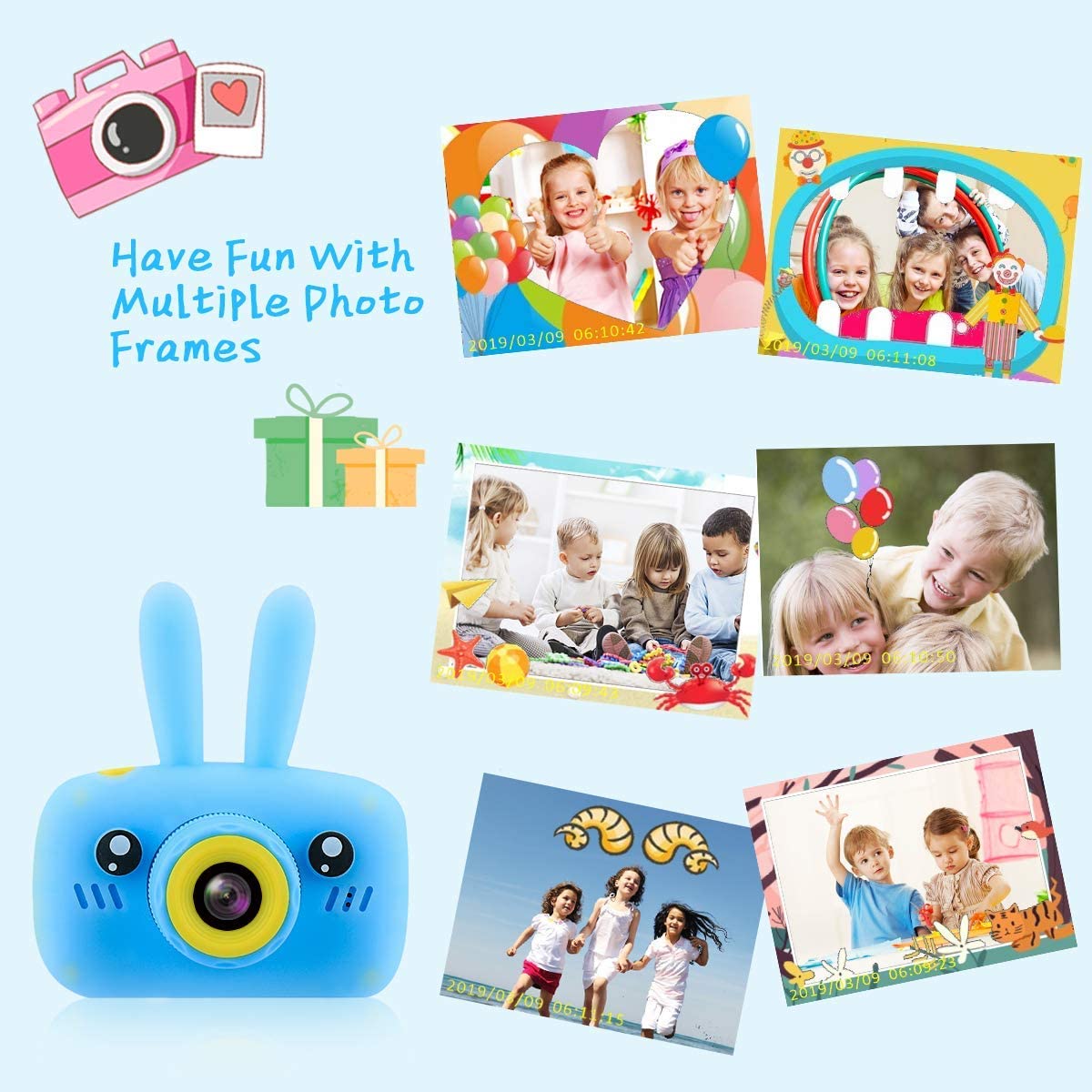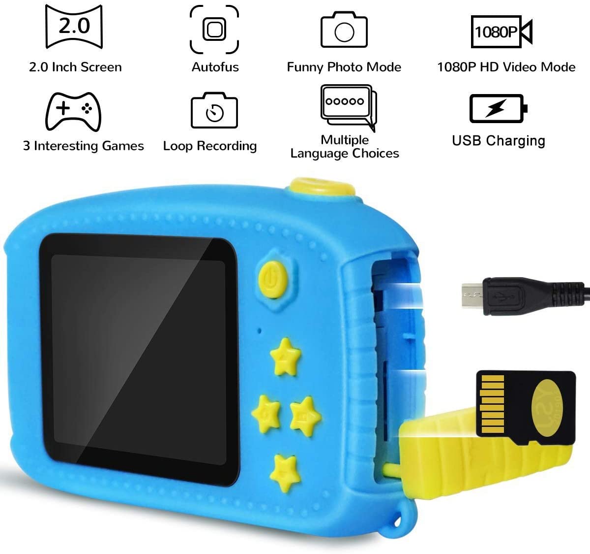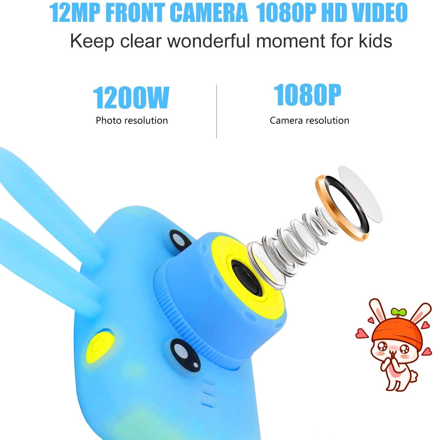 • 【1080P IPS Screen & 12.0 Mega pixels】The kids digital camera is enquiped with 2.4 inch colorful display 1080P HD IPS screen, can takes good 12.0 Mega pixels pictures,up to 1920x1080P Video,greatly improve the photos definition compared with other children cameras.