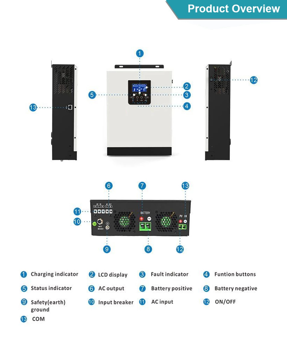 This is a multi-function inverter/chargei; combining functions of inverter solar charger and battery charger to offer uninterruptible power support with portable size. Its comprehensive LCD display offers user-configurable and easy-accessible button operation such as battery charging current, AC/solar charger priority and acceptable input voltage based on different applications.