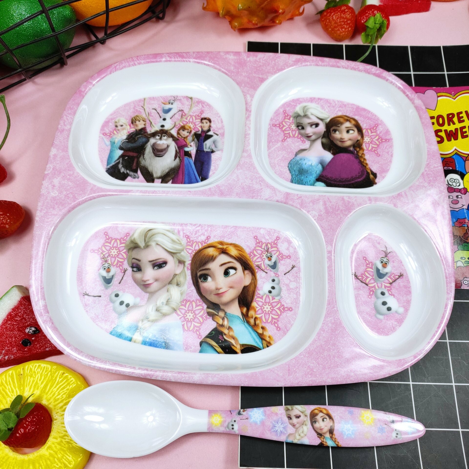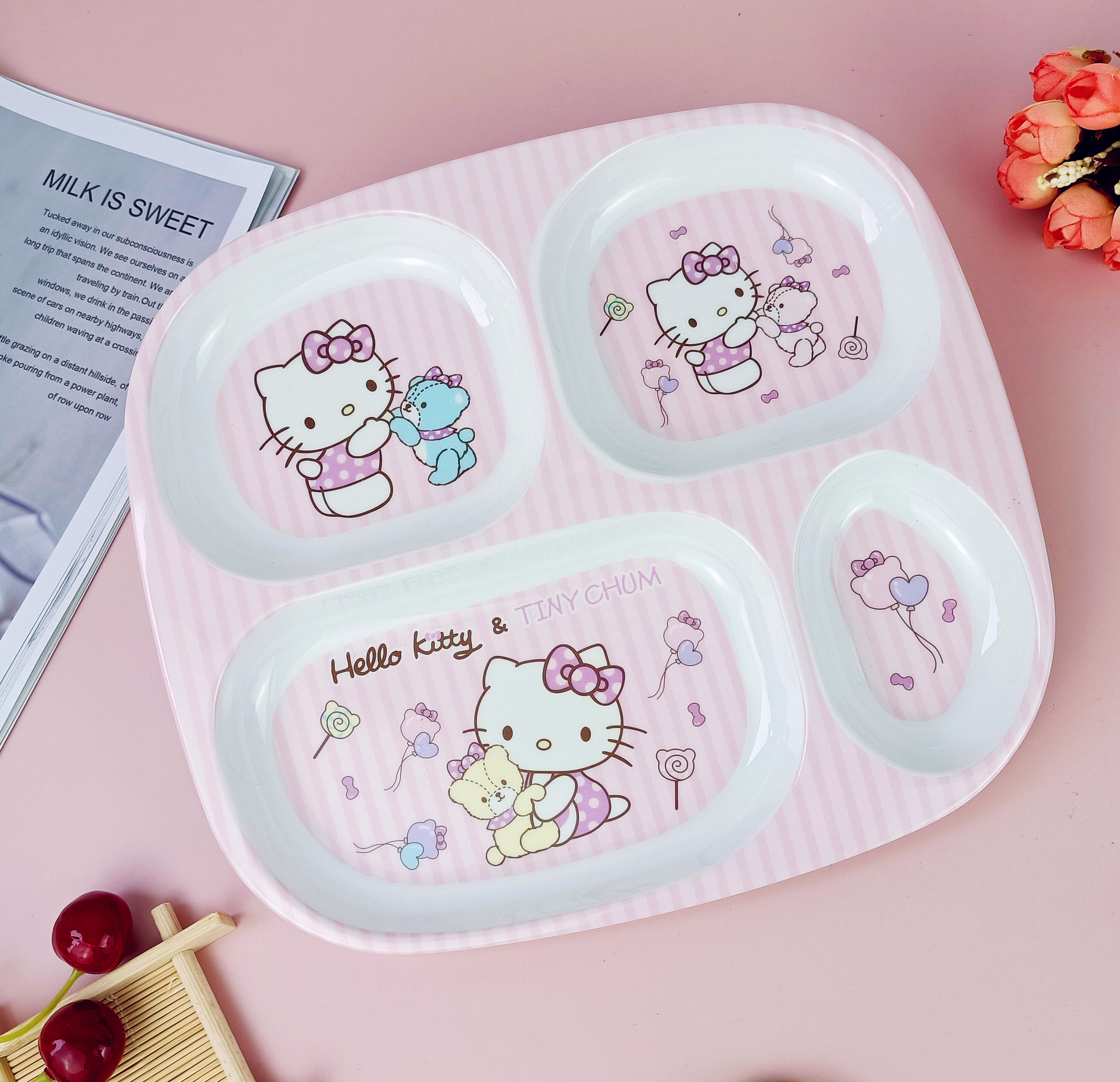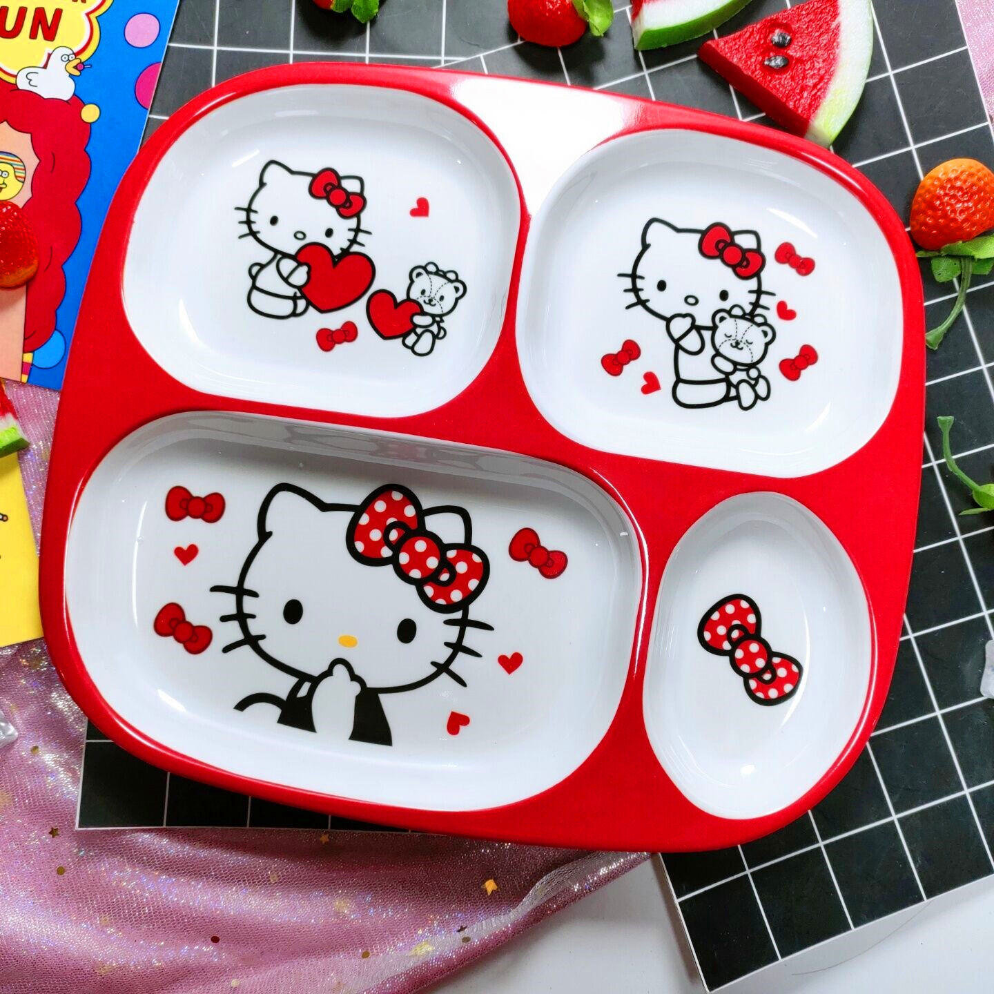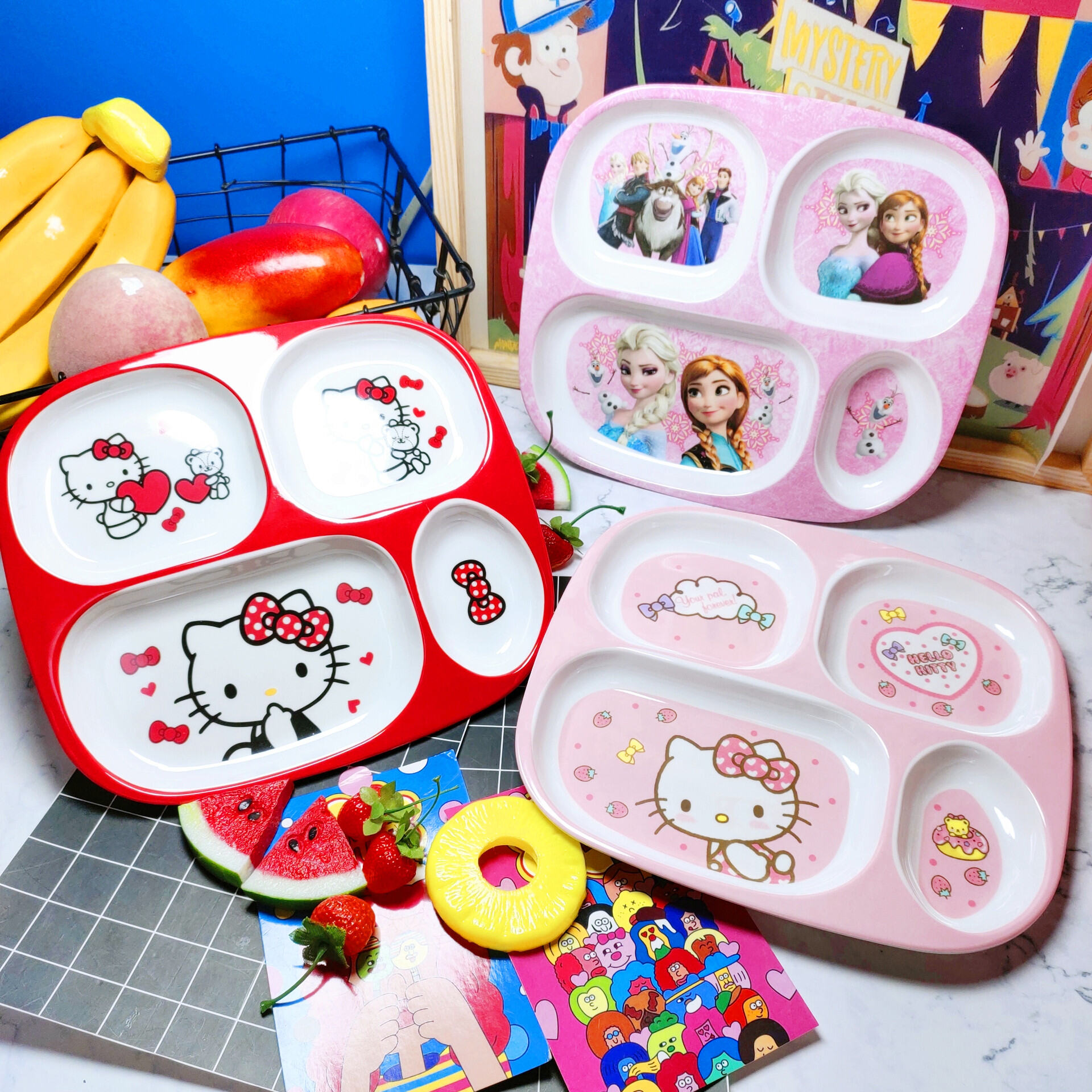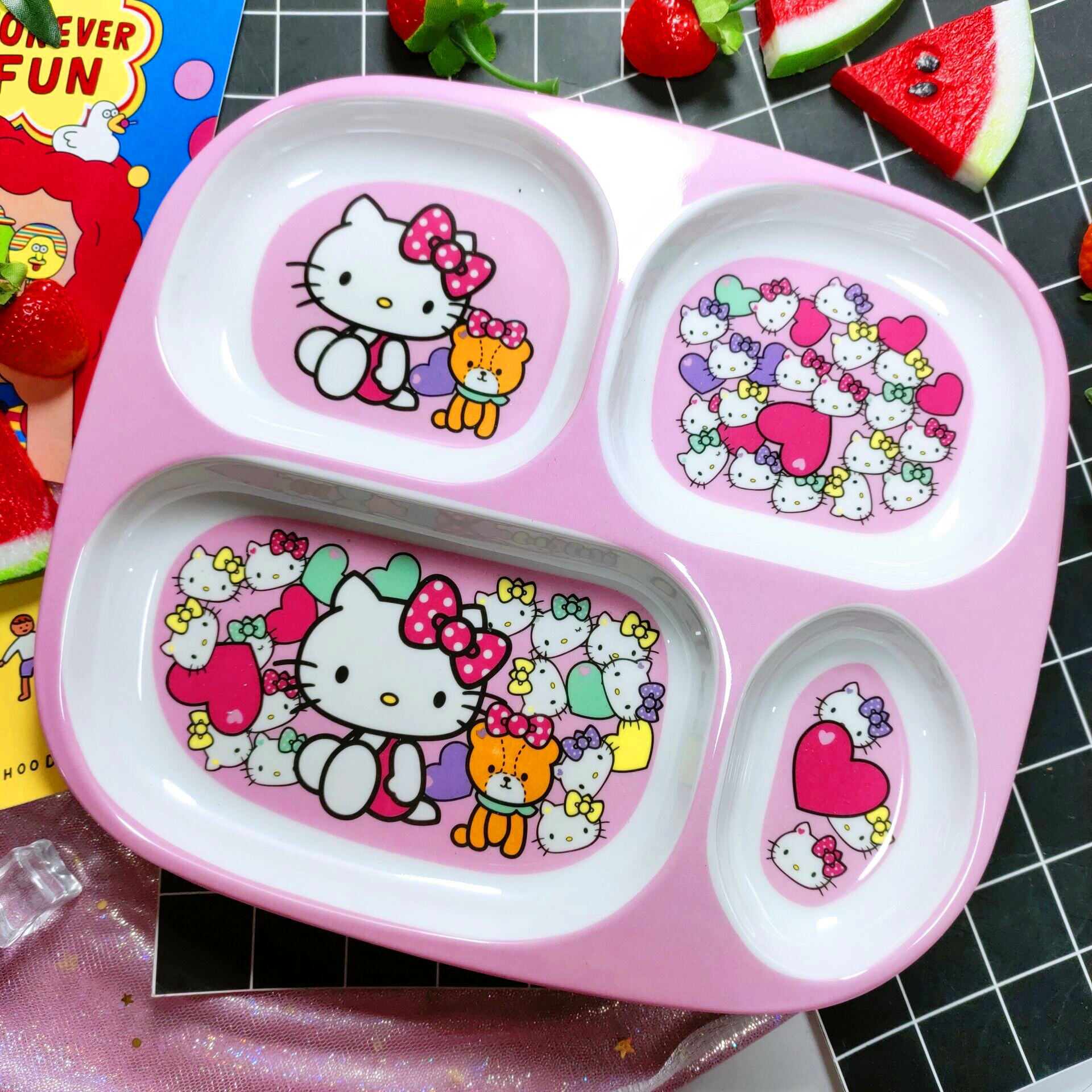 Children's Plate Cartoon Cute Baby Compartment Household Shatter-resistant Hello Kitty Plate Spoon Infant Food Supplement Learn to Eat