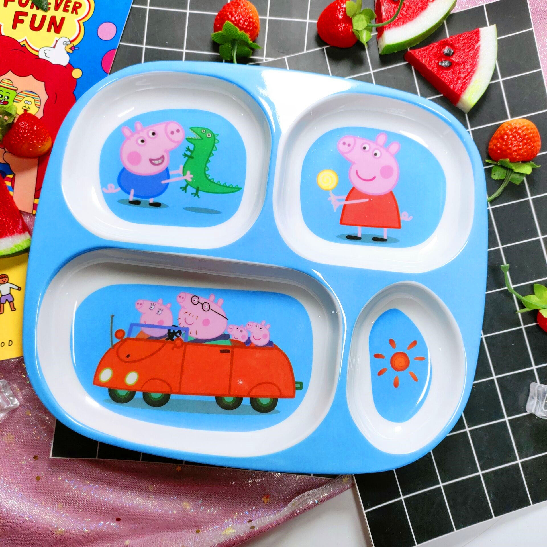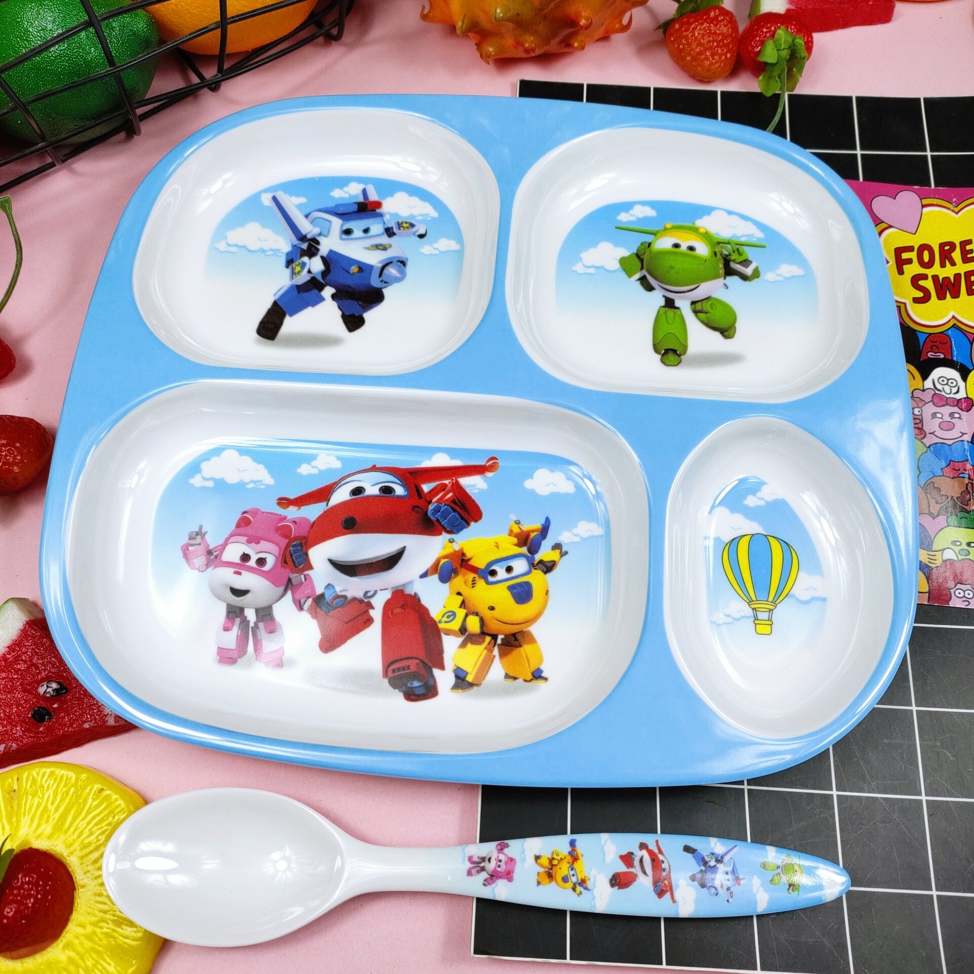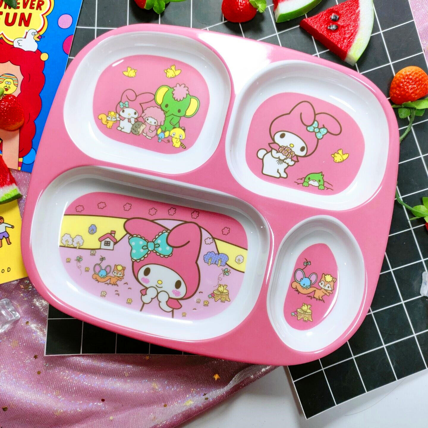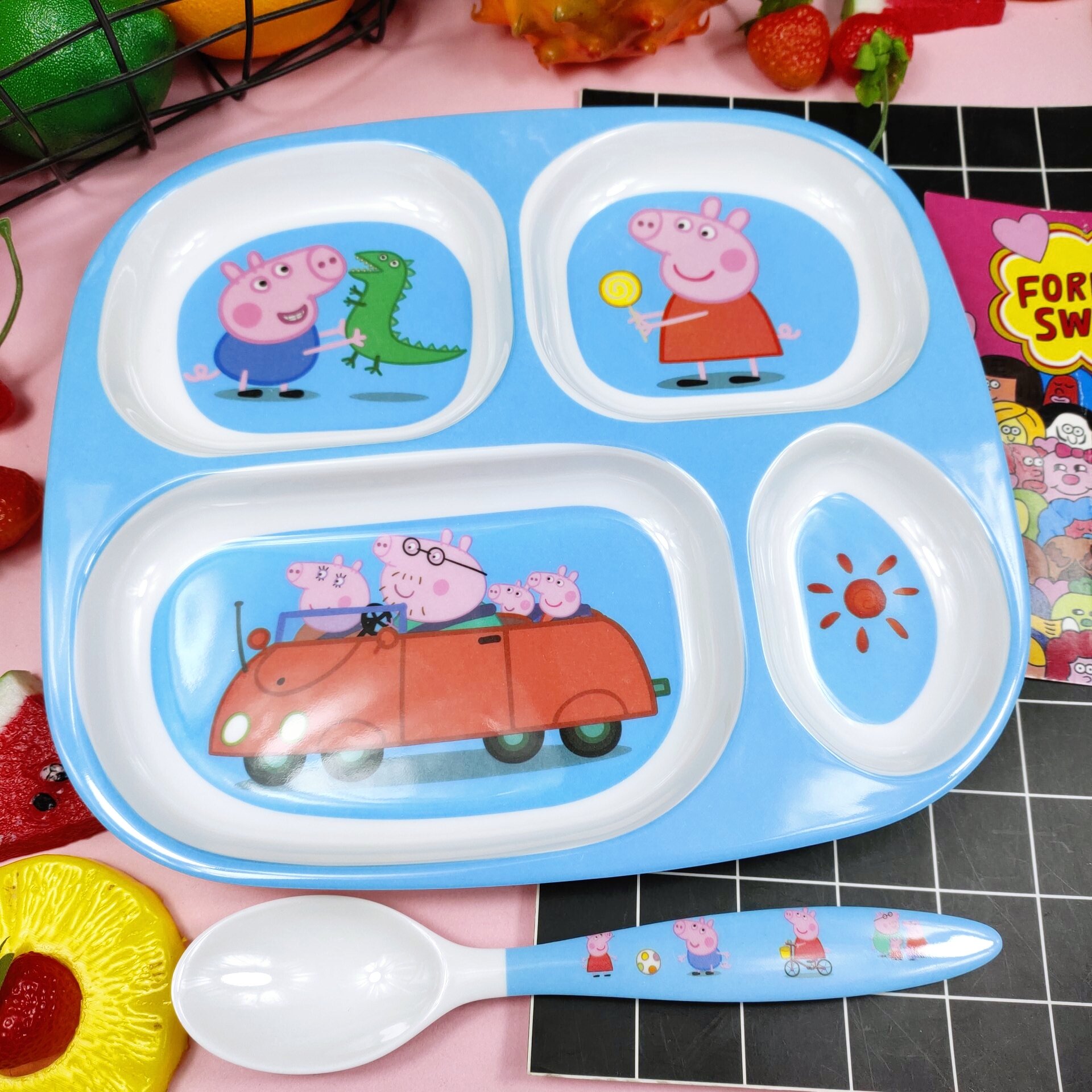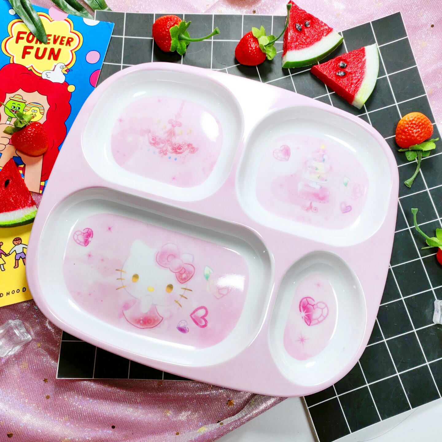 Children's Plate Cartoon Cute Baby Compartment Household Shatter-resistant Hello Kitty Plate Spoon Infant Food Supplement Learn to Eat