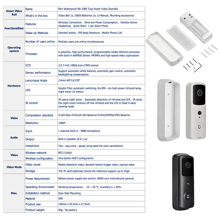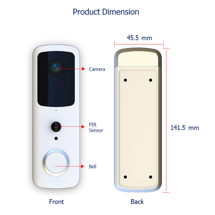 Wake-up mode: Wake-up by doorbell button, wake-up by PIR human body detection, active wake-up by the mobile phoneAlarm Push: Rapid Push within 1 second