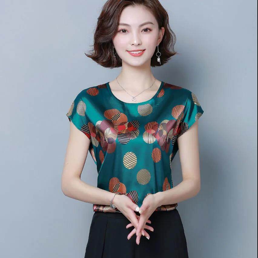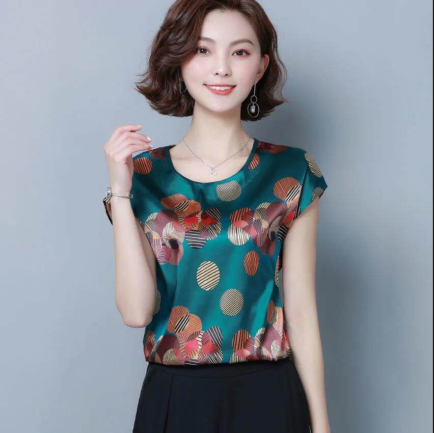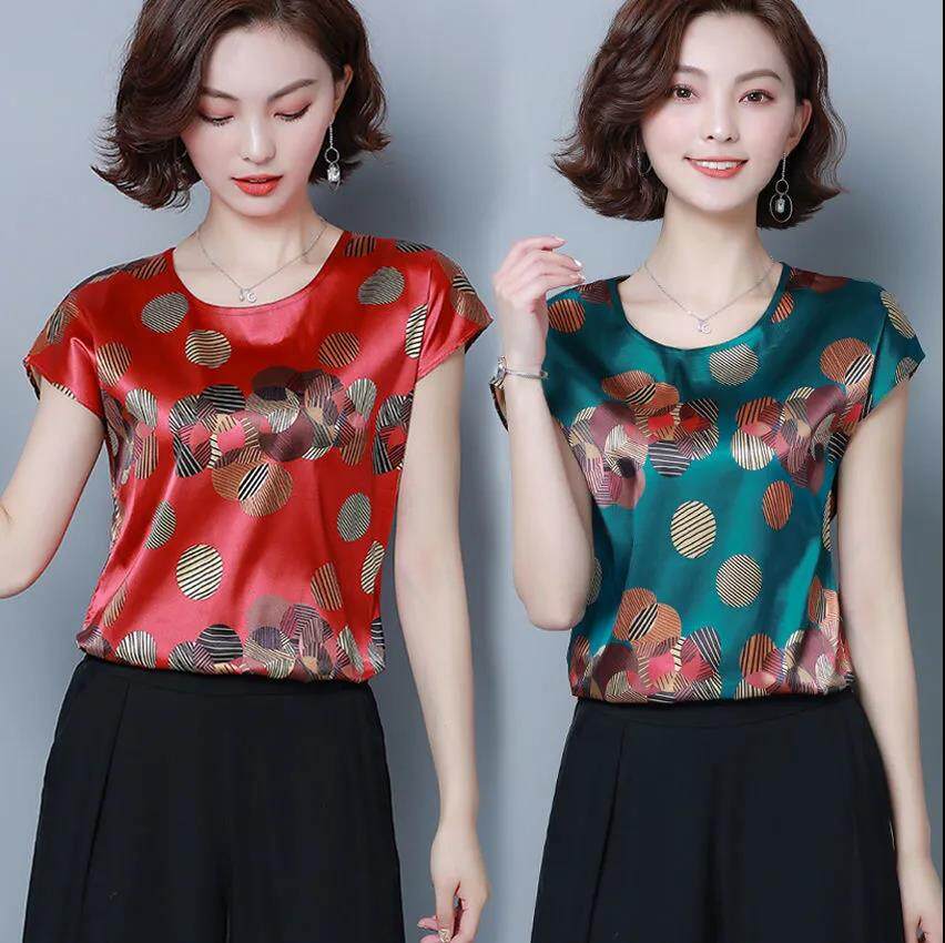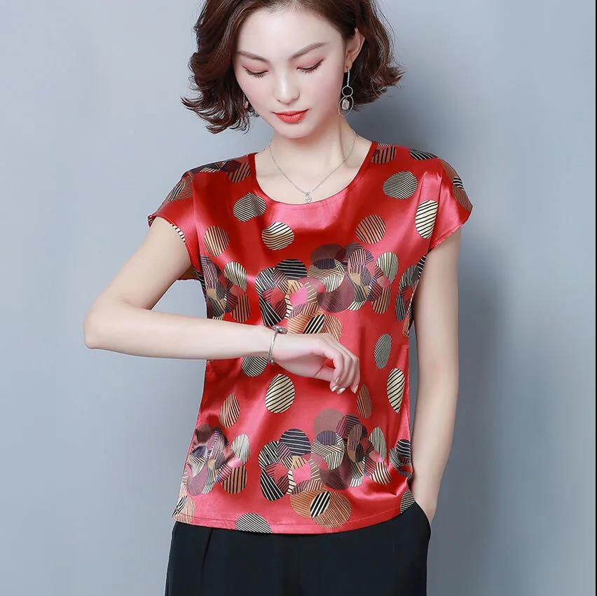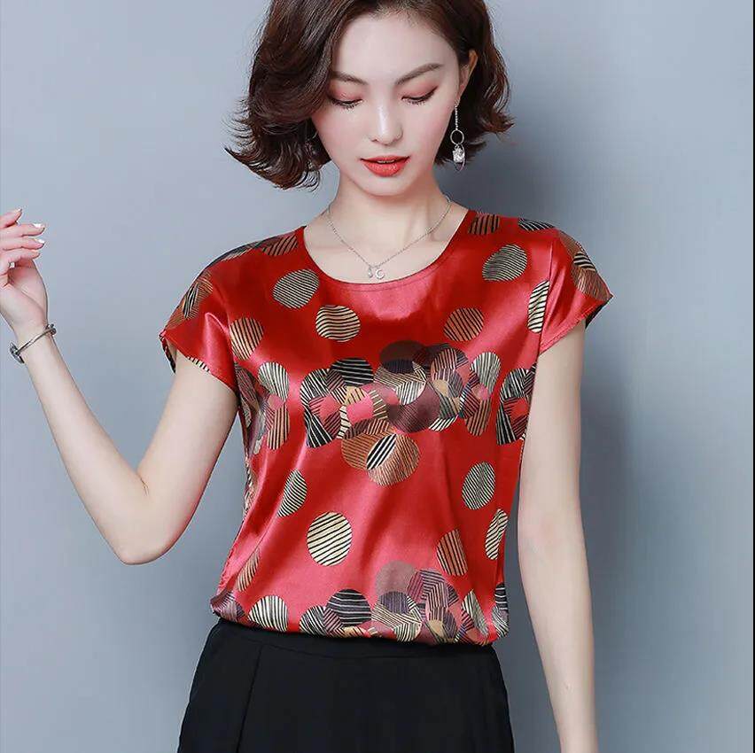 EDQRDQ Women's Casual Printed Short Sleeve Crew Neck Plus Size Satin Top Blouse Loose Silk Tops Shirt