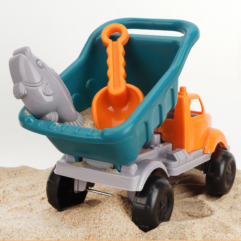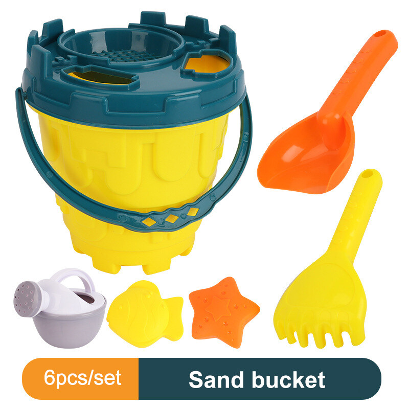 Set of 6 Trolley/Truck/Bucket Beach Toy for Sand Play Set with Cart Watering Can Rake Shovel and 2 Mini Molds for Kids