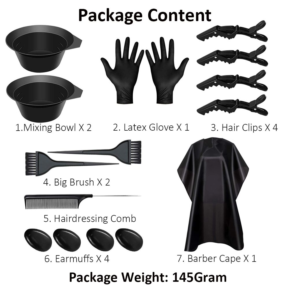 5. The large-pack professional hair dye kit including 2 mixing bowls, 2 large brushes, 2 pairs of earmuffs, 1 hairdressing comb, 1 pair of latex gloves, 1 barber cape, 4 sectioning hair clips.