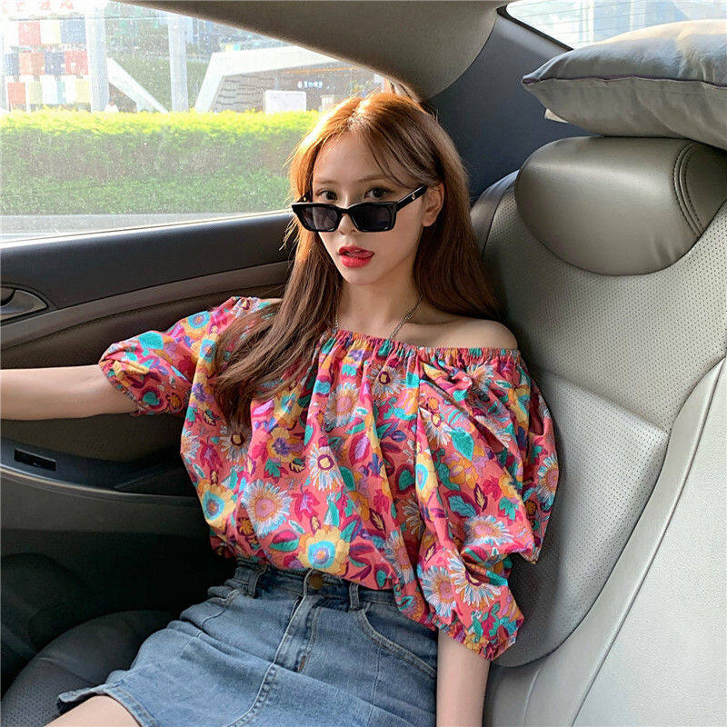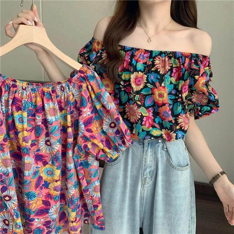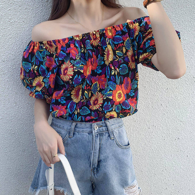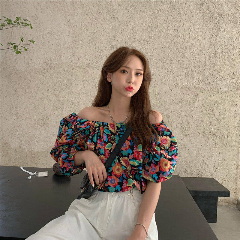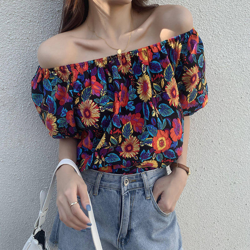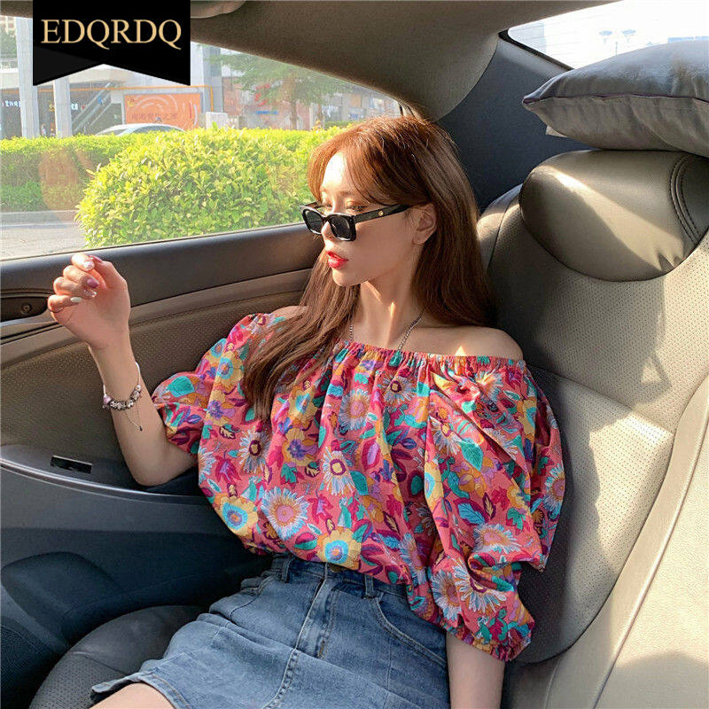 EDQRDQ Women's Puff Short Sleeve Off Shoulder Chiffon Blouse Summer Floral Print Casual T Shirts