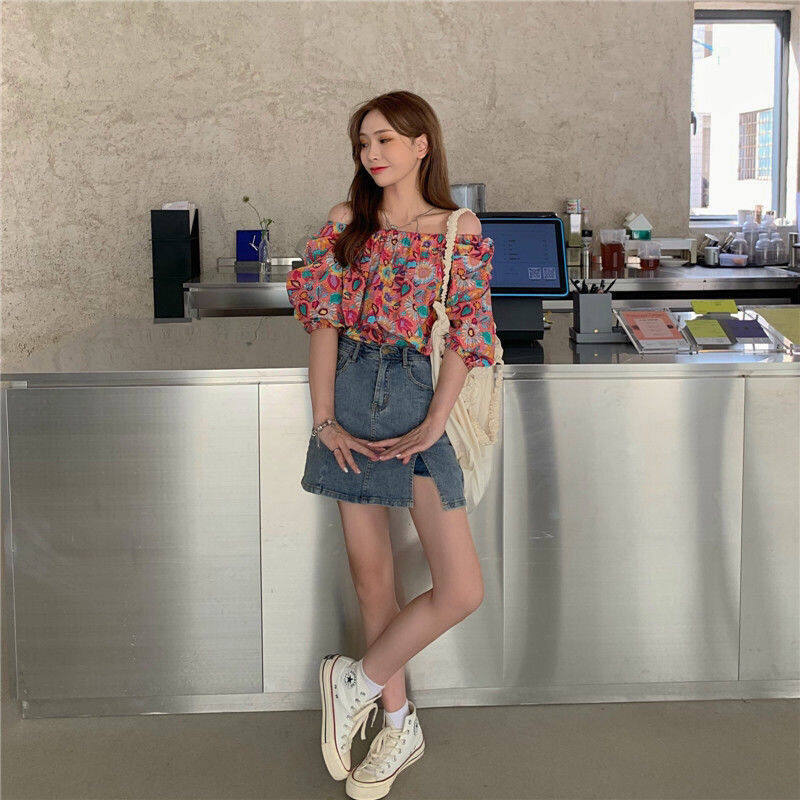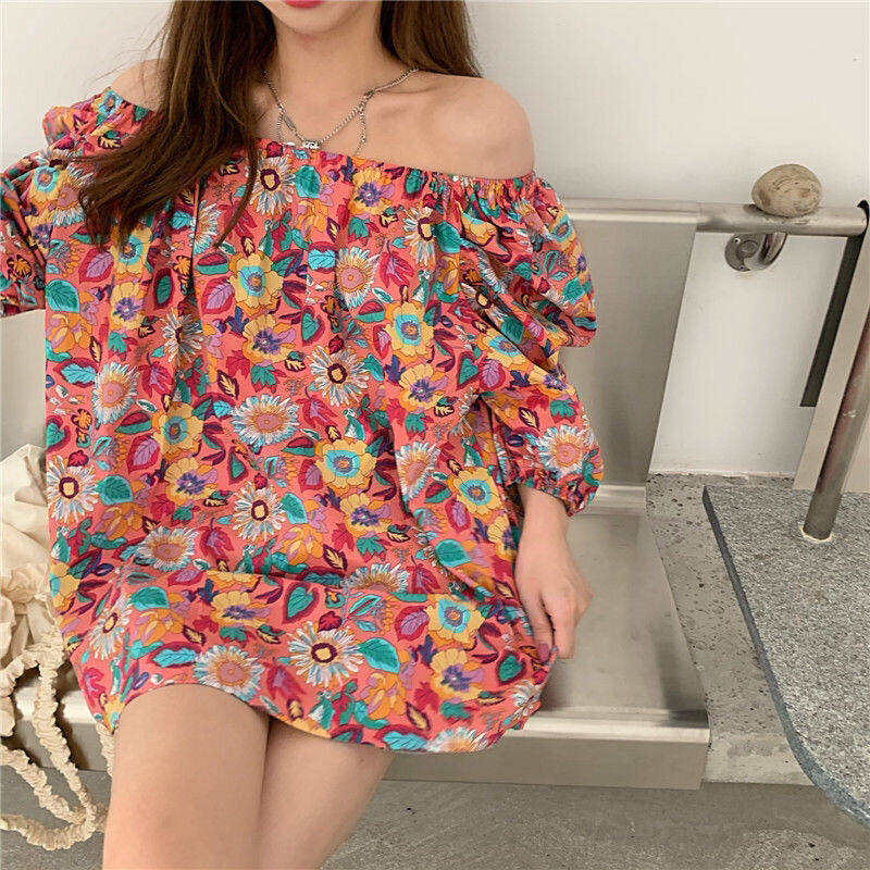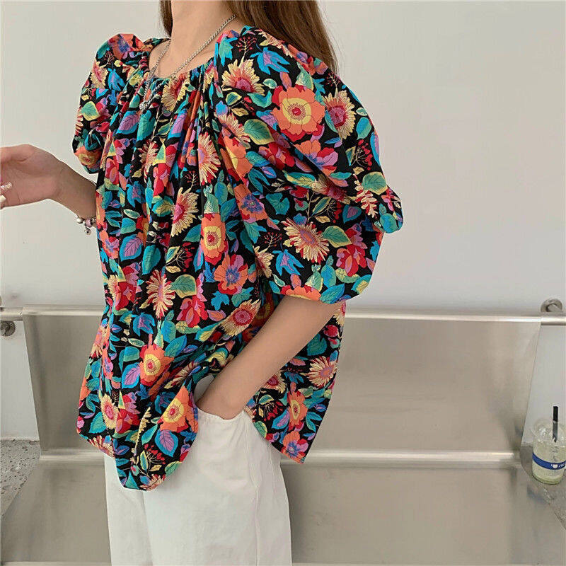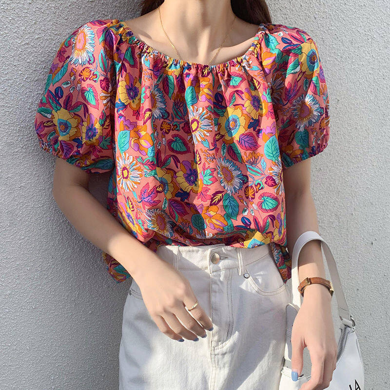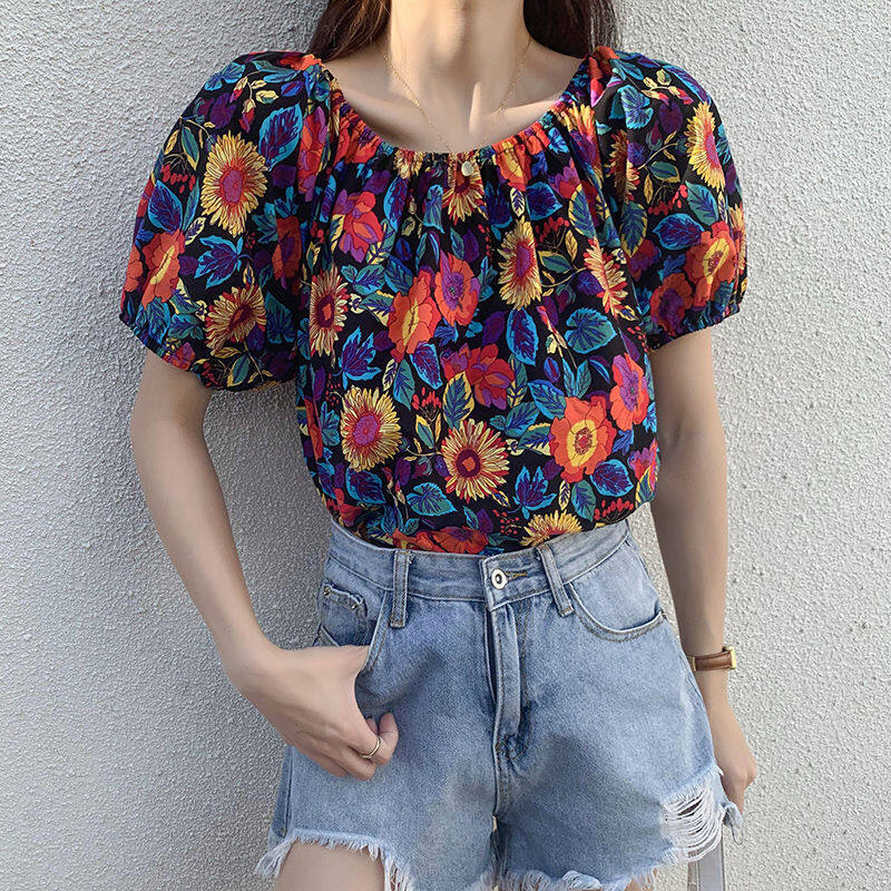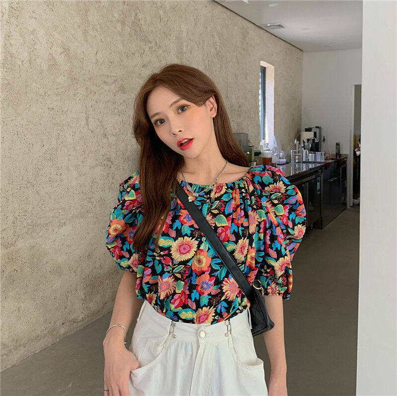EDQRDQ Women's Puff Short Sleeve Off Shoulder Chiffon Blouse Summer Floral Print Casual T Shirts