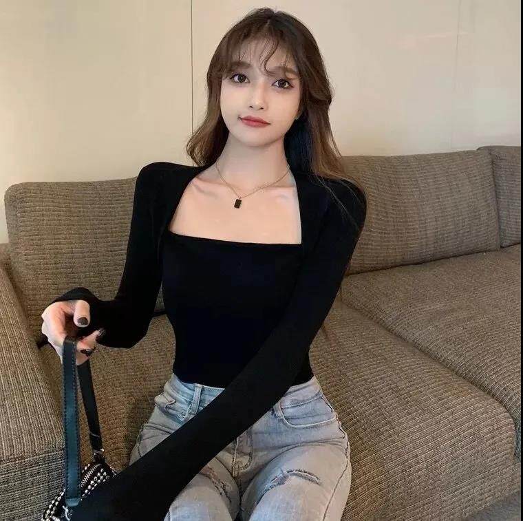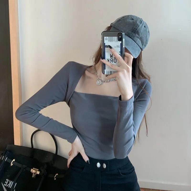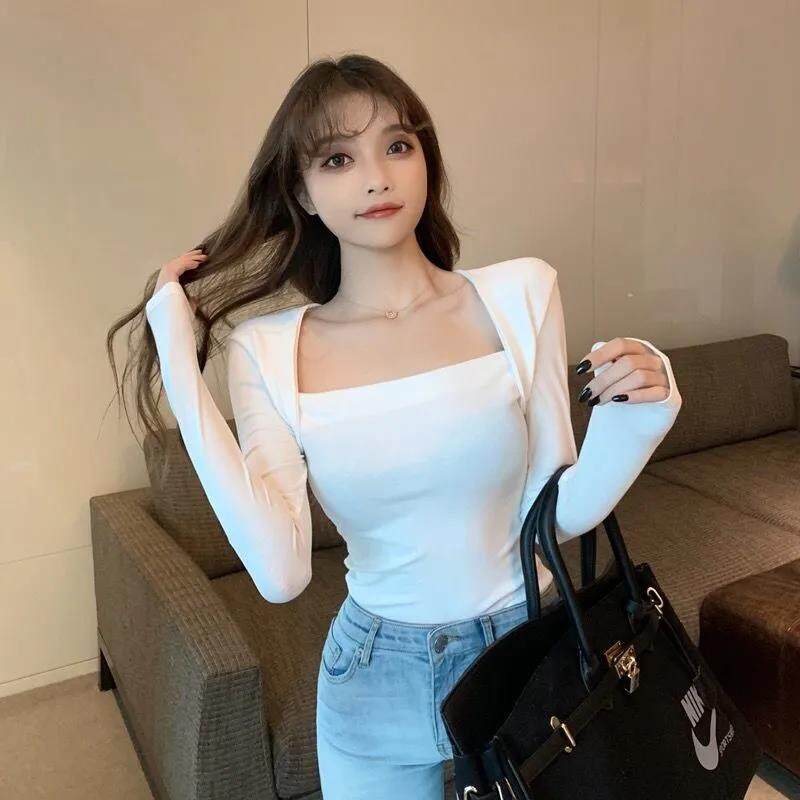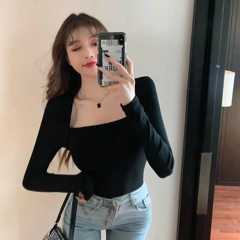 EDQRDQ Women's Casual Square Neck Slim Fitted Basic Long Sleeve Solid Crop Tee Top