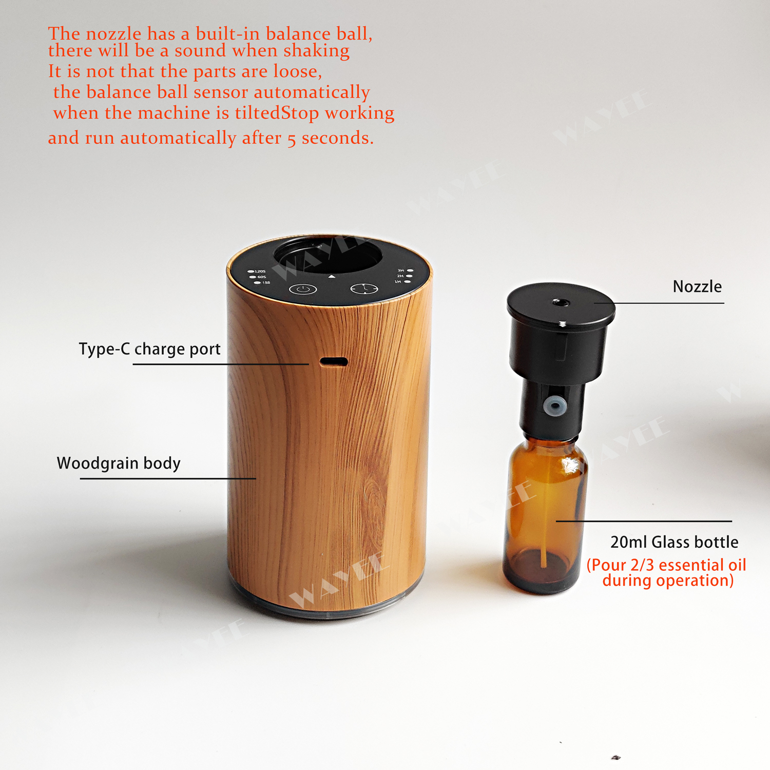Warning&Caution 1. Use input voltage DC5V, computer USB interface, USB interface adapter or car charger with USB interface(please choose the certified charger from branded manufacturer). 2. After the product is installed and used, it cannot be turned over or titledfor a long time. 3. There is an anti-tilting device inside the machine, shaking will make sounds; this is normal. 4.Only need to fill half a bottle of essential oil when you use it. If it is full,the essential oil will leak out when the machine is dumped. FQC 1. How long does it take to fully charge the battery? Answer: 4~6 hours. 2. What kind of essential oil does the product use instructions? Answer: It is recommended to use pure plant essential oils or essential oils that are volatile without impurities and are not viscous. 3. Can't see the amount of mist when the product is turned on? Answer: a. This is a normal phenomenon. The product itself has the function of automatically adjusting the atomized particles. To save essential oils to the greatest extent; b. The atomized particles are only 1~3 nanometers, which is difficult to catch with the naked eye. 4. About the fragrance? Answer: The scent concentration of each essential oil is different. When the machine is running, use your lips to approach the nozzle and feel gas coming out.Indicates that the machine is operating normally; some essential oils will have a weaker smell. Influencing the aromatherapy effect of essential oils, as long as the essential oil molecules diffuse in the air and are absorbed by the body, they will have the aromatherapy effect of essential oils. It is not necessary to have a strong smell of essential oils in the entire air, which will cause olfactory fatigue and discomfort. 5. About the sound during use Answer: there will be the sound of motor vibration when the machine is running, which are all sounds that meet the indoor use standards.Everyone has different sensitivity to sound. #Nebulizer #aromadiffuser #aromatherapy #gift #Accumulator #aromatic #timing #Portable #Essentialoil