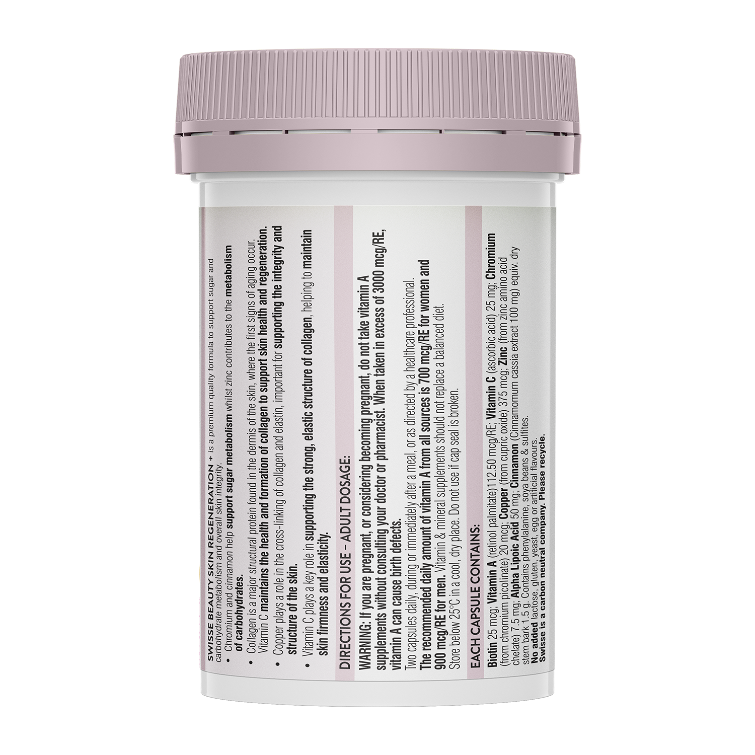 --------------- BENEFITS --------------- Helps sugar & carbohydrate metabolism Supports collagen formation Supports skin regeneration --------------------- INGREDIENTS --------------------- KEY INGREDIENTS: Chromium and cinnamon help support sugar metabolism whilst zinc contributes to the metabolism of carbohydrates. Collagen is a major structural protein found in the dermis of the skin, where the first signs of ageing occur. Vitamin C maintains the health and formation of collagen to support skin health and regeneration. Copper plays a role in the cross-linking of collagen and elastin, important for supporting the integrity and structure of the skin. Vitamin C plays a key role in supporting the strong, elastic structure of collagen, helping to maintain skin firmness and elasticity. EACH CAPSULE CONTAINS: Biotin 25 mcg; Vitamin A (retinol palmitate) 112.50 mcg/RE; Vitamin C (ascorbic acid) 25 mg; Chromium (from chromium picolinate) 20 mcg; Copper (from cupric oxide) 375 mcg; Zinc (from zinc amino acid chelate) 7.5 mg; Alpha Lipoic Acid 50 mg; Cinnamon (Cinnamomum cassia extract 100 mg) equiv. dry stem bark 1.5 g. ALLERGEN INFORMATION Contains phenylalanine, soya beans & sulfites. No added lactose, gluten, yeast, egg or artificial flavours. ------------------- DIRECTIONS ------------------- ADULT DOSAGE: Two capsules daily, during or immediately after a meal, or as directed by a healthcare professional. --------------- STORAGE --------------- Store below 25°C in a cool, dry place. Do not use if cap seal is broken. ----------------- WARNINGS ----------------- If you are pregnant, or considering becoming pregnant, do not take vitamin A supplements without consulting your doctor or pharmacist. When taken in excess of 3000 mcg/RE, vitamin A can cause birth defects. The recommended daily amount of vitamin A from all sources is 700 mcg/RE for women and 900 mcg/RE for men. Vitamin & mineral supplements should not replace a balanced diet.