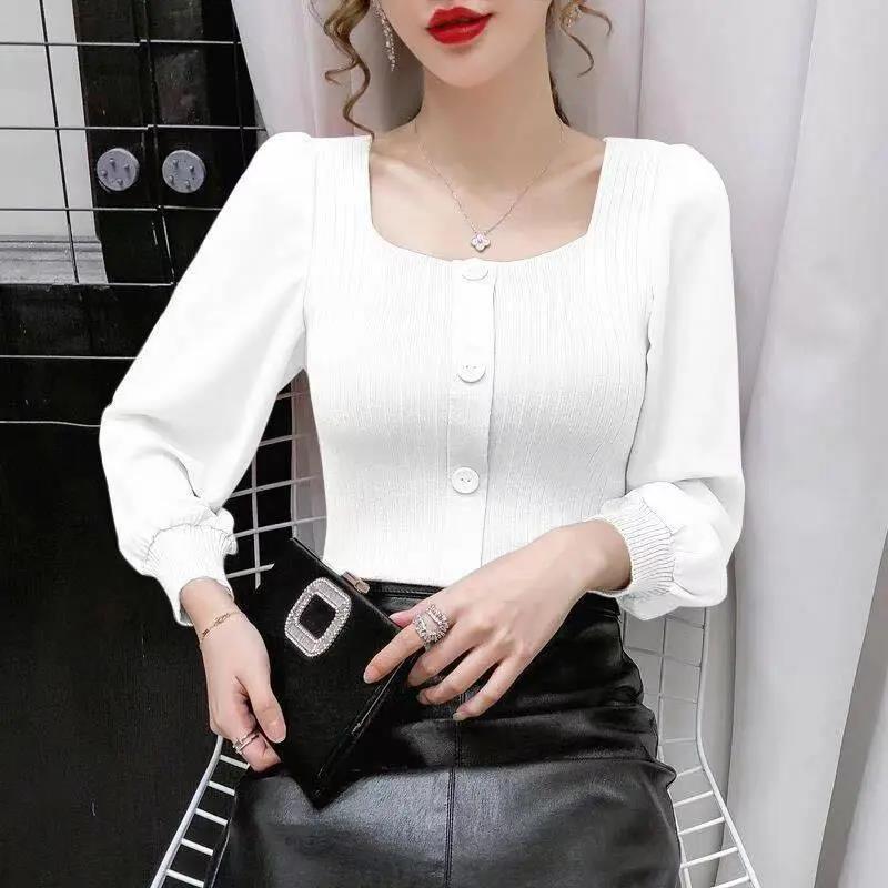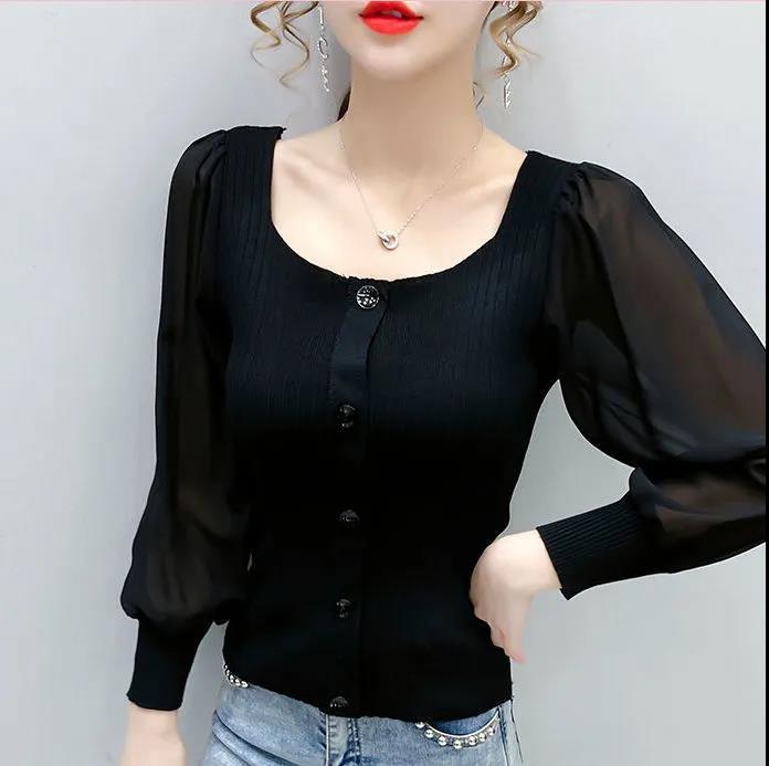 EDQRDQ Women's Puff Long Sleeve Contrast Mesh Square Neck Pullover Blouse Top