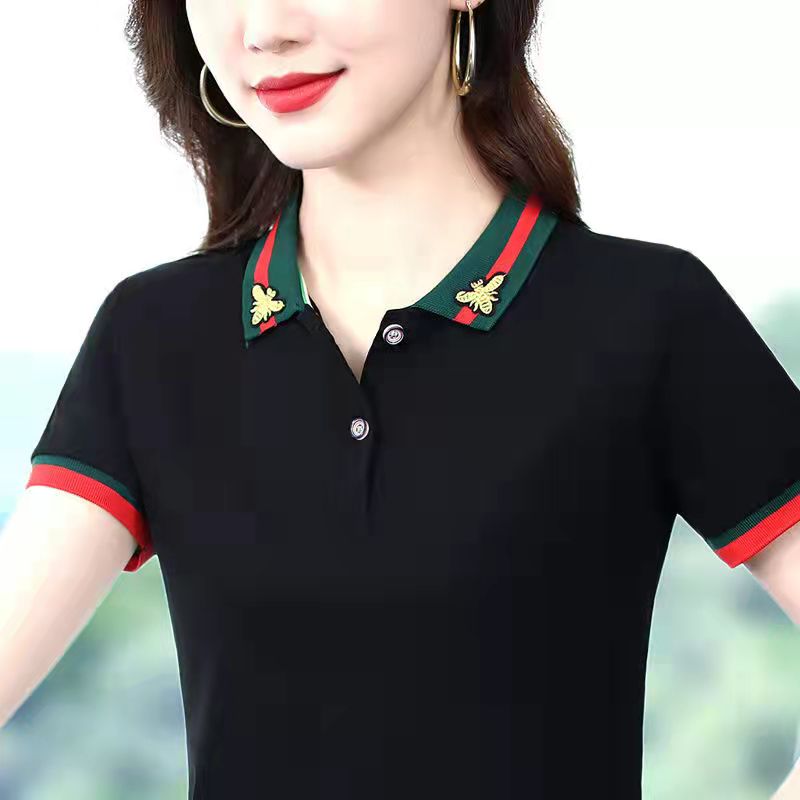 Retro Embroidery Casual Sport Short Sleeve Polo Shirt for Women Lapel T-shirts Stretch Classic Korean Style polo tee Female short sleeve Shirt Plus Size 100KG Fat Lady Can Wear