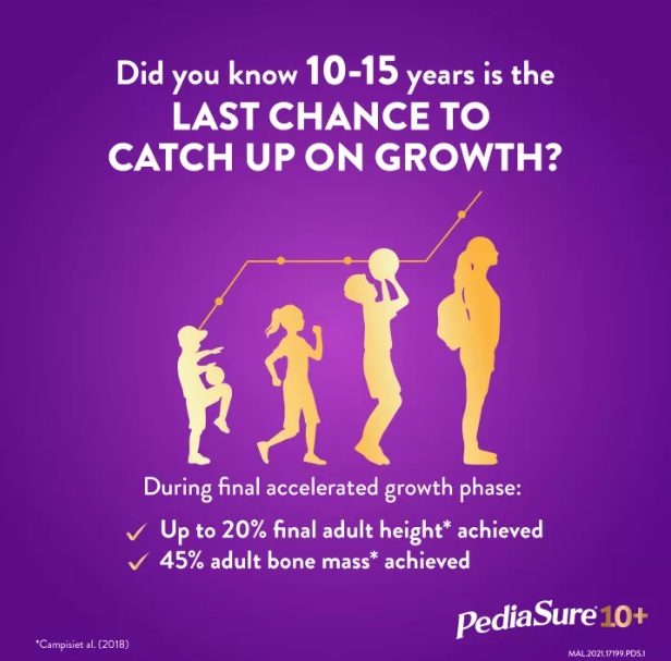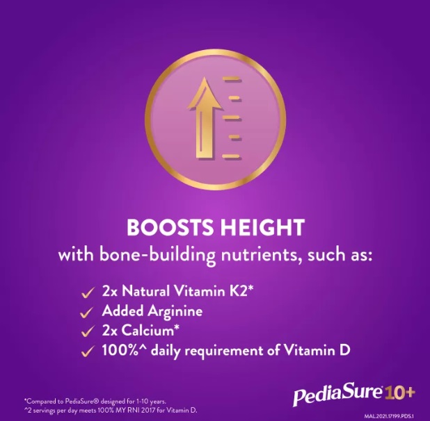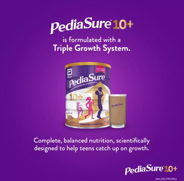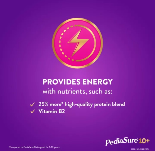 PediaSure® 10+ is a complete, balanced nutrition supplement, scientifically designed to support the nutritional needs during periods of accelerated growth in kids 10-15 years of age with a unique Triple Growth System, supporting increased height, energy release and overall growth and development.