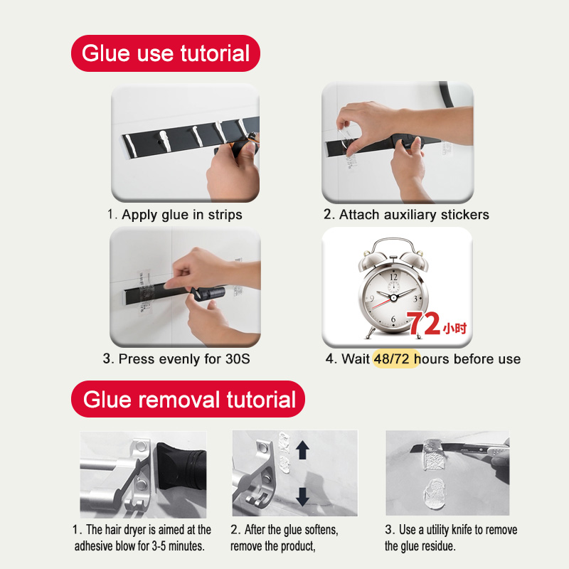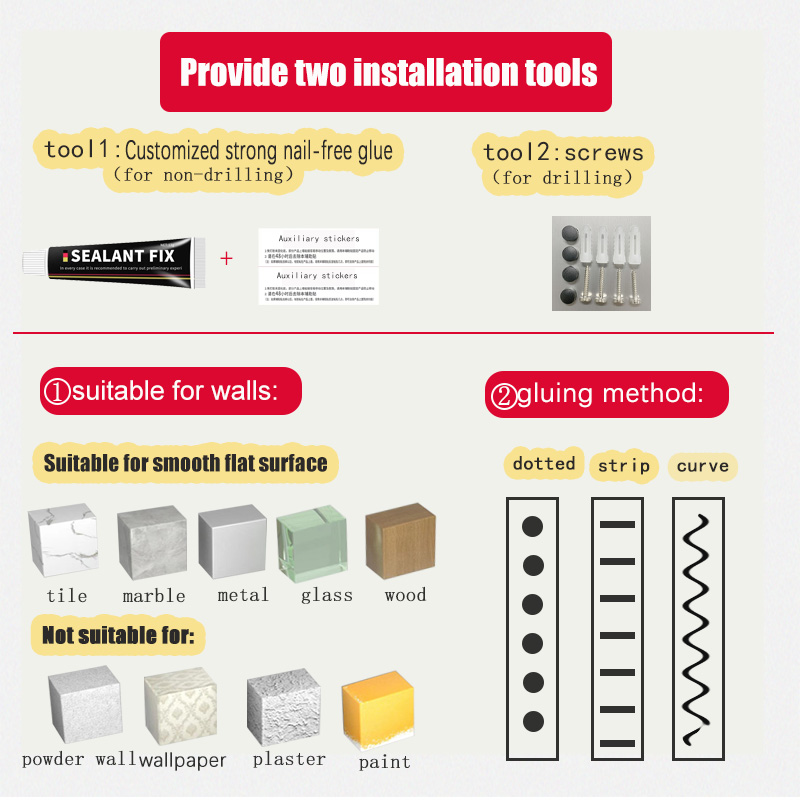 【About installation】We provide two installation tools in the package:①drilling tool:screw(Follow the traditional wall-drilling method)②non-drilling:nail-free glue(Installation instructions are included in the package)