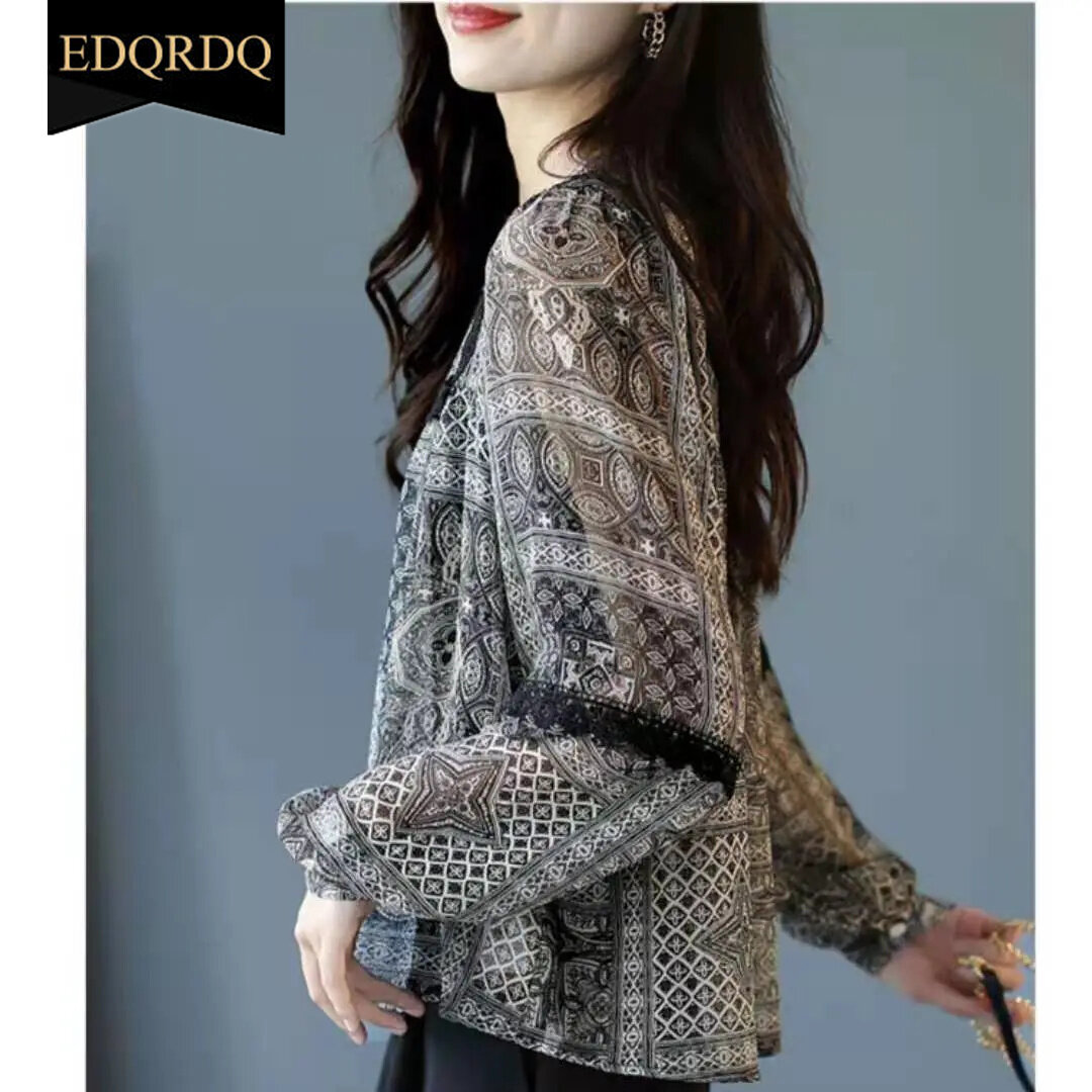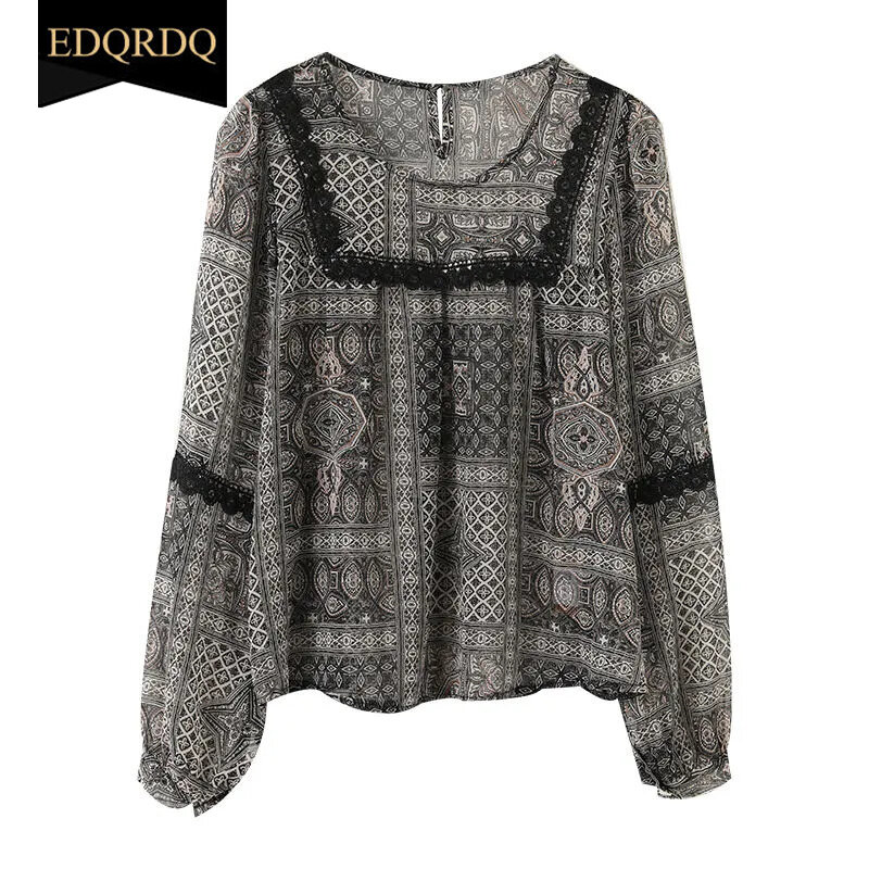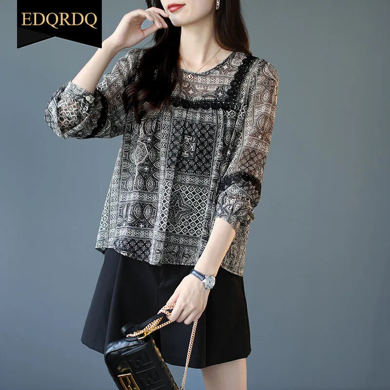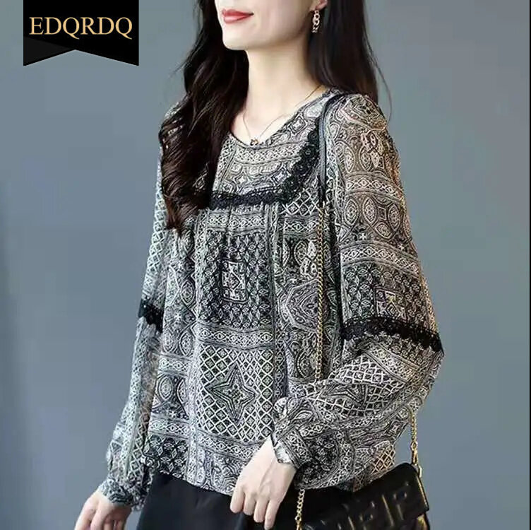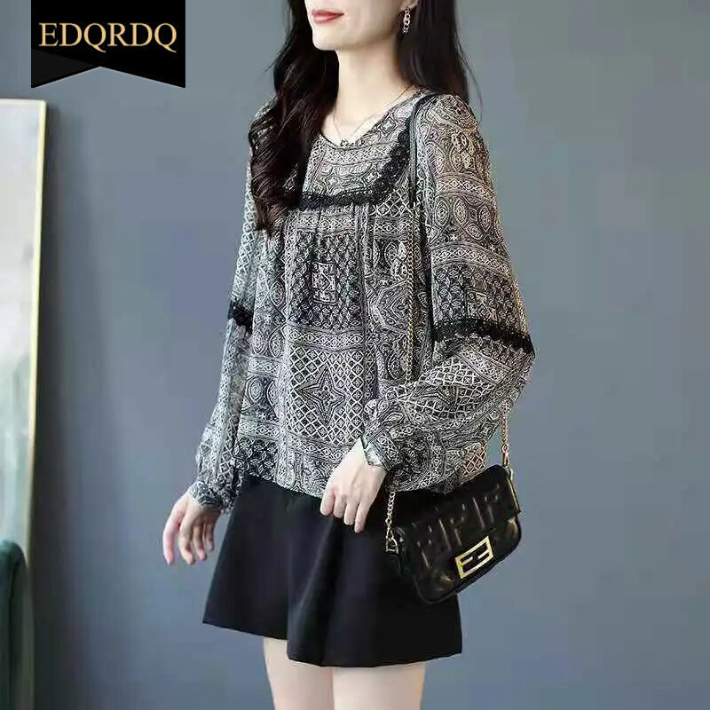 EDQRDQ Floral Chiffon Blouses Plus Size Loose Lace Joint Ladies Shirts Tops