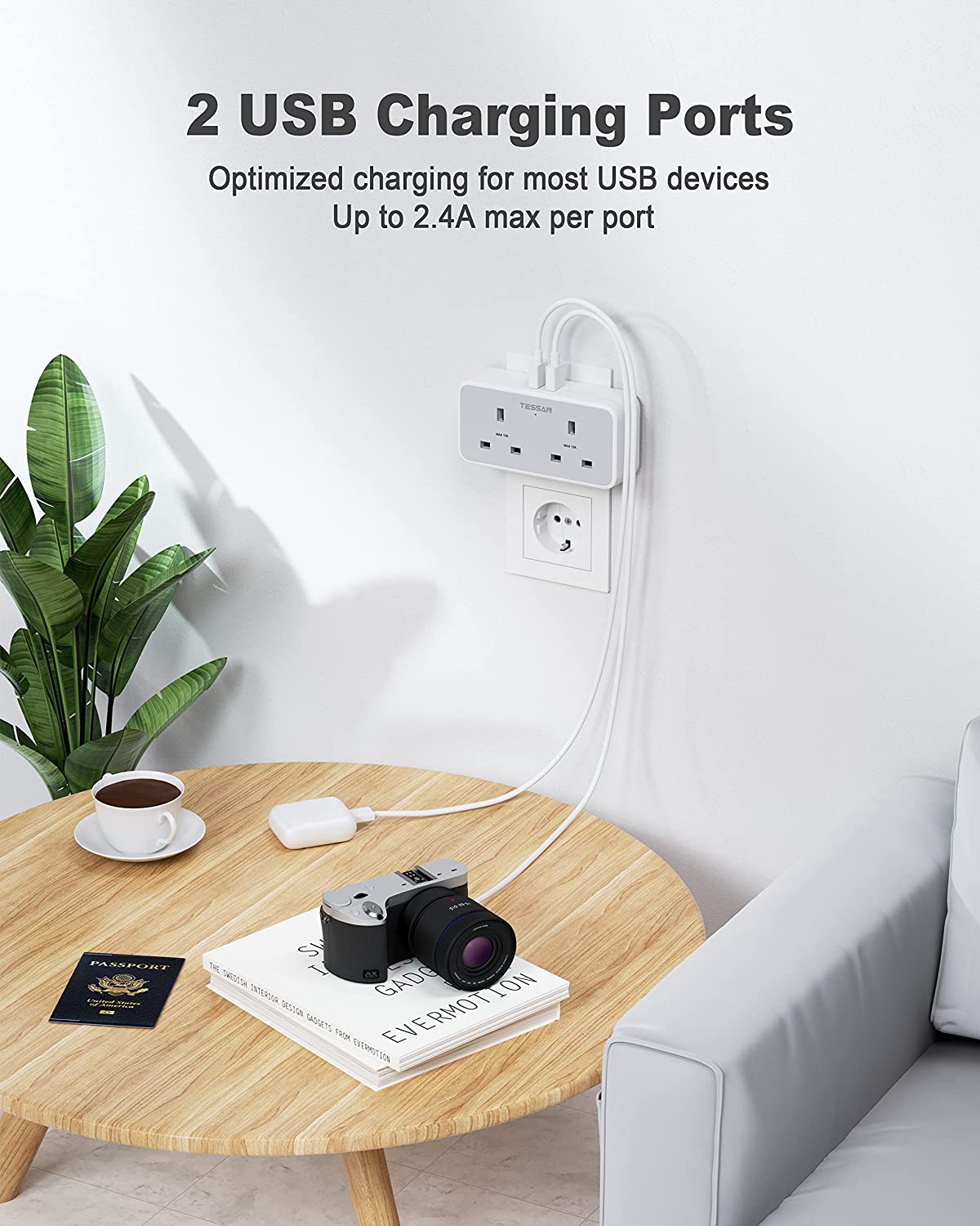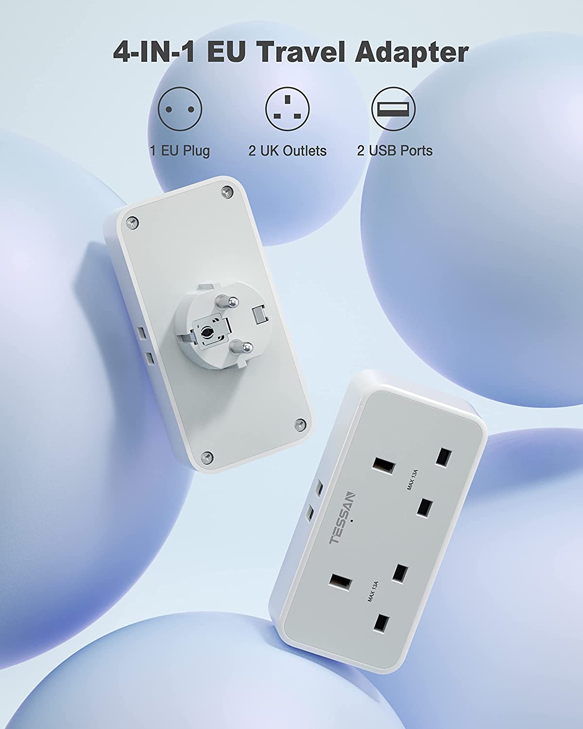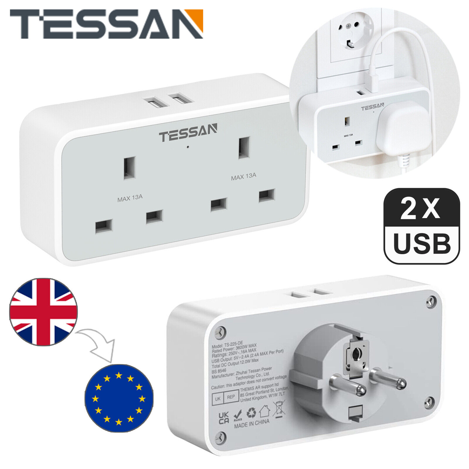 TESSAN 2 Way Europe Plug Adapter with 2 USB Ports