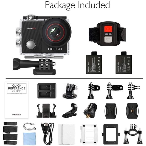 What's in the Box:1x AKASO EK7000 Pro Action Camera/ 1x 2.4G Remote Control/ 1x Battery Charger/ 2x 1050mAh Battery/ 1x Waterproof Case/ 1x Bicycle Stand/ 7x Mount/ 2x Clip/ 1x Helmet Mounts/ 1x Bandages/ 5x Tethers/ 1 x Protective Backdoor/ 1x USB Cable/ 1x Lens Cloth/ 1x Quick Reference Guide