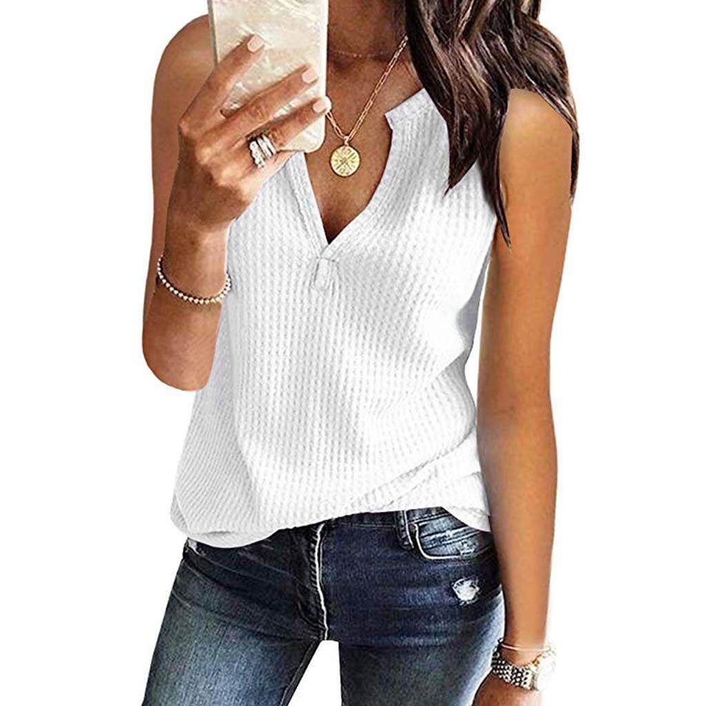 Womens Fashion V Neck Shirts Sleeveless Solid Waffle Knit Loose Fitting Tee Tops