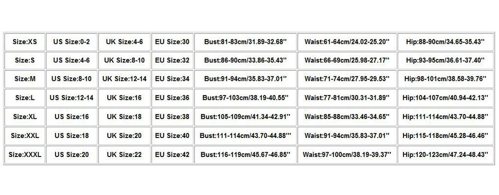 | Size:XS | US Size:0-2 | UK Size:4-6 | EU Size:30 | Bust:81-83cm/31.89-32.68'' | Waist:61-64cm/24.02-25.20'' | Hip:88-90cm/34.65-35.43'' |